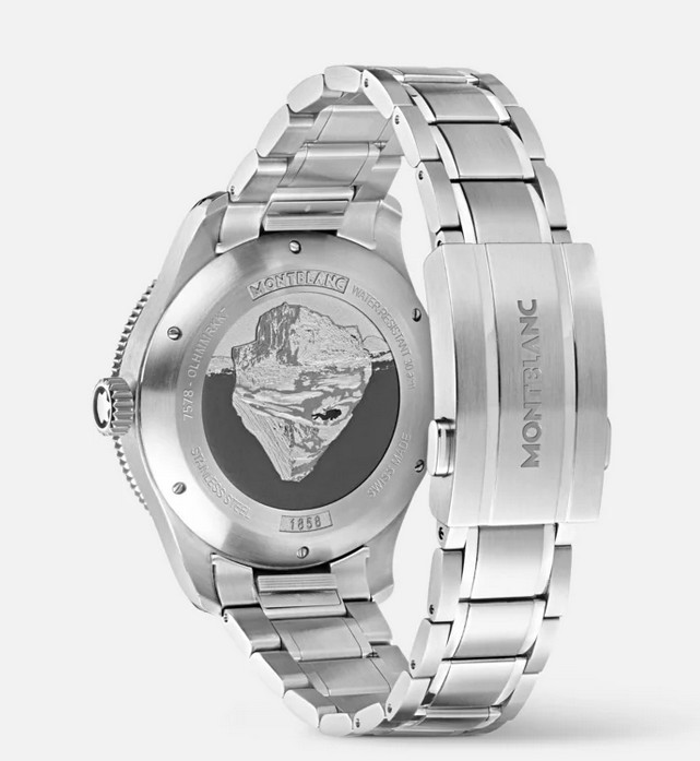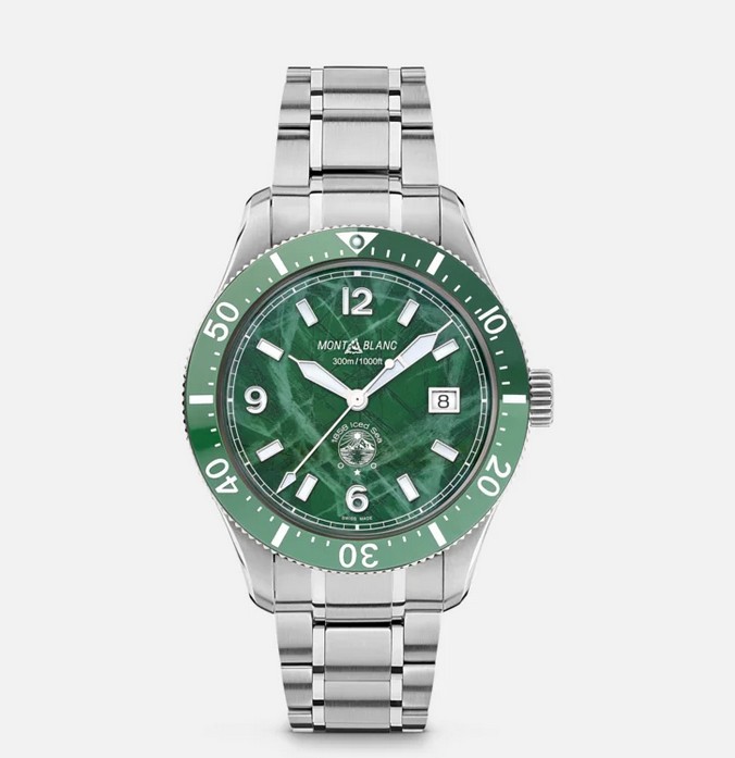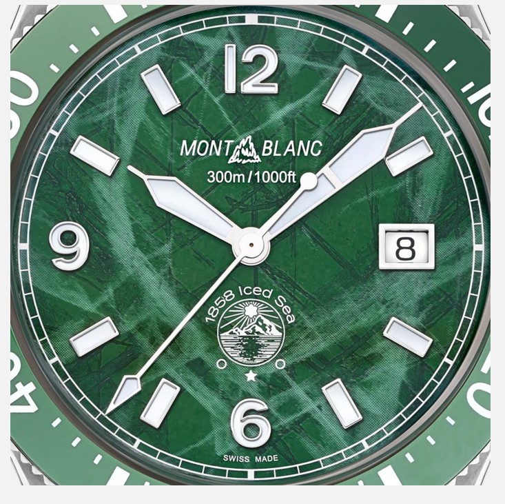 Als erste Taucheruhr von Montblanc verfügt die Montblanc 1858 Iced Sea Automatic Date über ein Zifferblatt mit Eisbergmotiv, das den Eindruck vermittelt, als blicke man in die Tiefen eines Gletschers. Das grüne Eisbergmuster ist von Mer de Glace inspiriert, diem Hauptgletscher des Mont Blanc Massivs. Seine Textur wurde mithilfe einer nahezu in Vergessenheit geratenen Technik erhalten, dem „gratté-boisé“. Die Uhr verfügt über eine einseitig drehbare, zweifarbige Keramiklünette, einen gravierten Gehäuseboden und ein schmal verlaufenden, austauschbares Edelstahlarmband mit feinen Einstellungen für einen präzisen Sitz. Die Uhr erfüllt die Anforderungen der ISO 6425 Norm für Taucheruhren und ist wasserdicht bis 300 Meter.
