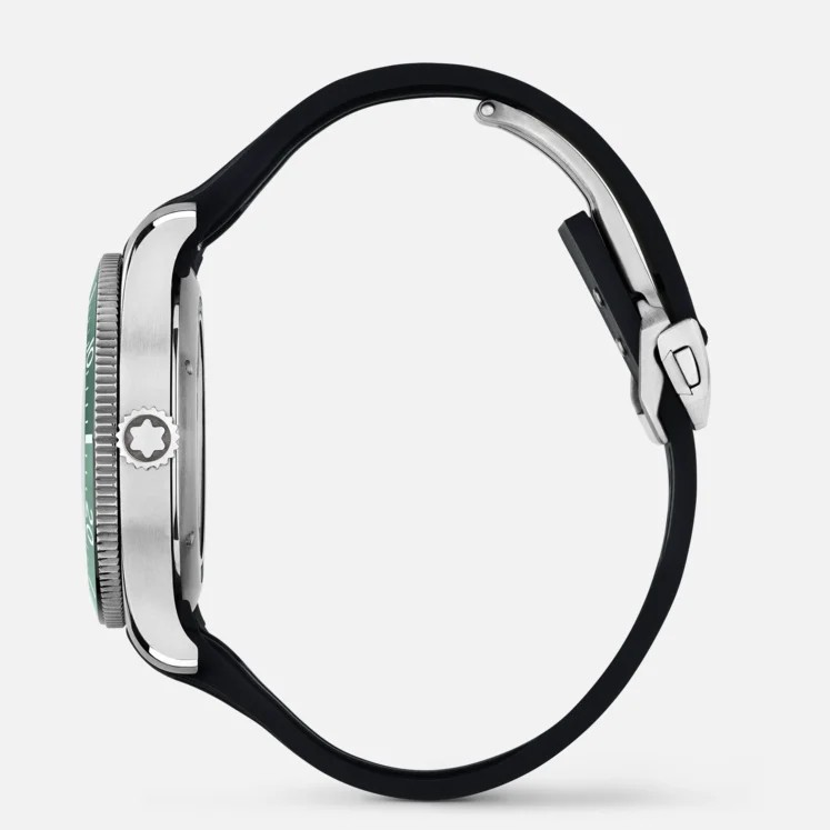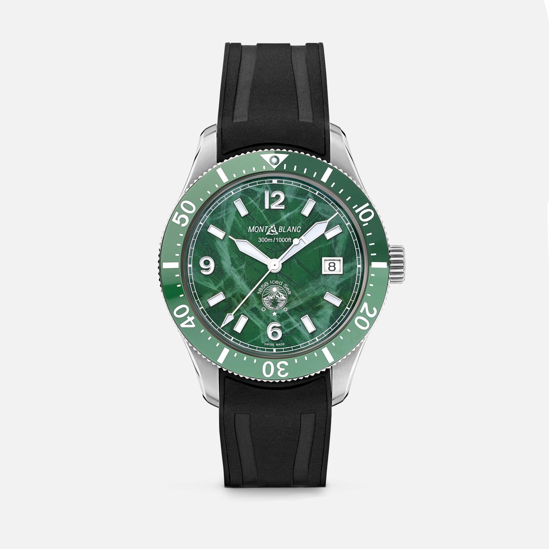 Als erste Taucheruhr von Montblanc verfügt die Montblanc 1858 Iced Sea Automatic Date über ein Zifferblatt mit Eisbergmotiv, das den Eindruck vermittelt, als blicke man in die Tiefen eines Gletschers. Das grüne Eisbergmuster ist von Mer de Glace inspiriert, diem Hauptgletscher des Mont Blanc Massivs. Seine Textur wurde mithilfe einer nahezu in Vergessenheit geratenen Technik erhalten, dem „gratté-boisé“. Die Uhr verfügt über eine einseitig drehbare, zweifarbige Keramiklünette, einen gravierten Gehäuseboden und ein austauschbares schwarzes Kautschukarmband mit einem raffinierten Einstellungssystem. Die Uhr erfüllt die Anforderungen der ISO 6425 Norm für Taucheruhren und ist wasserdicht bis 300 Meter.