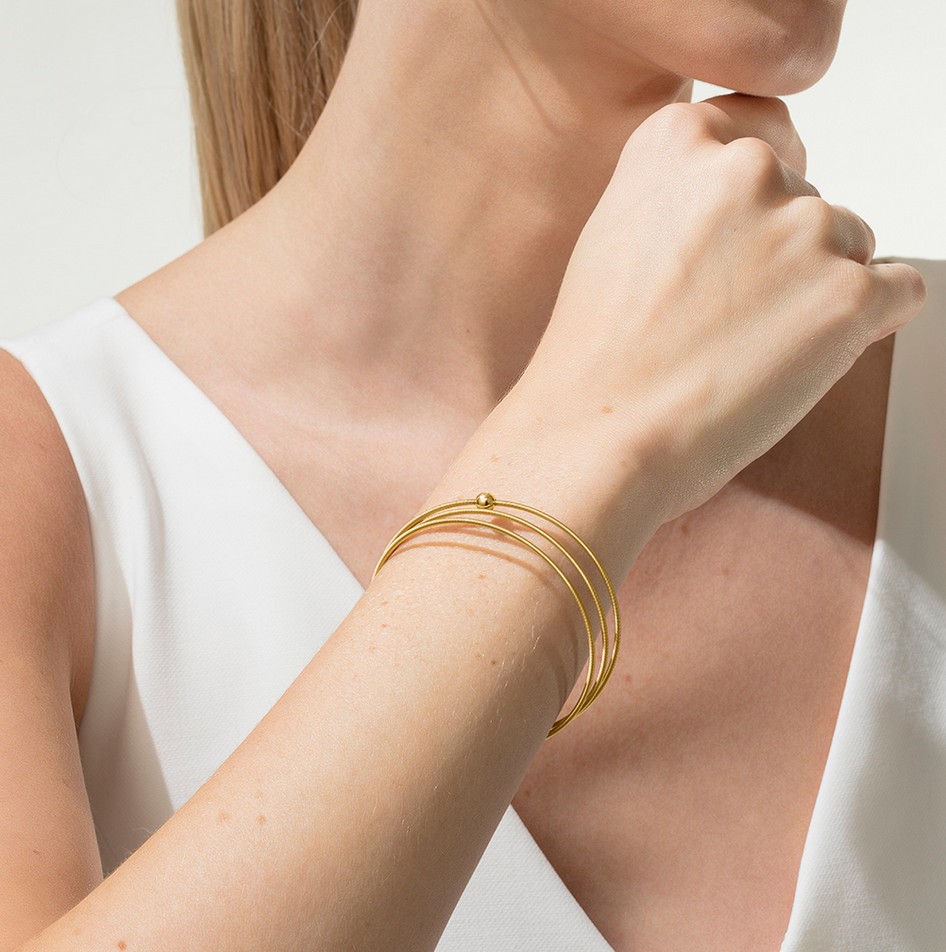 1,5 Kilogramm Gold, drei erfahrene Goldschmiede und ein ganzer Tag Arbeit: macht 3.000 Meter Niessing Schnur. Hört sich nach einer einfachen Gleichung an? Ist es nicht! Es braucht viele kleine, sehr aufwändige Schritte, um die Niessing Schnur für Colette herzustellen. Ihre Fertigung basiert auf dem uralten Handwerk des Drahtziehens. Die Goldschmiede in unserer Manufaktur beherrschen es perfekt: Sie ziehen Gold- oder Platindraht immer und immer wieder. Mit Diamantwerkzeugen verleihen sie dem Edelmetall seinen feinen Glanz. Wichtig für die perfekte Form der Niessing Schnur ist das absolut kreisrunde Profil des Drahtes. Wenn die Drähte fertig sind, werden sie äußerst präzise um einen transparenten Kern aus Nylon gewickelt: Er verstärkt den Glanz der Schnüre von innen heraus. Zum Schluss erhält jedes Niessing Colette noch ihre handpolierte Kugel.