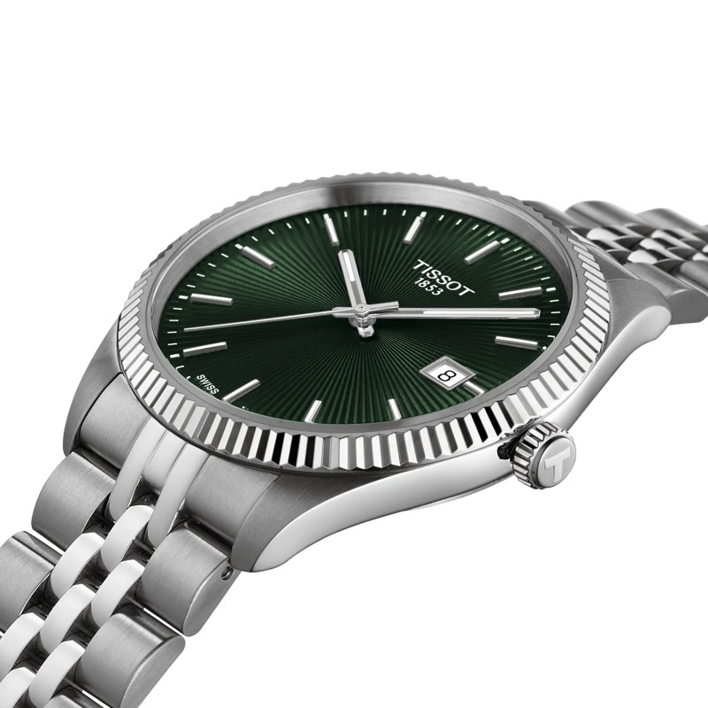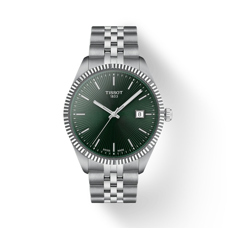 Diese Ausführung der Tissot Ballade 40mm besitzt ein 316L-Edelstahlgehäuse mit 40 mm Durchmesser und kratzfestem, entspiegeltem Saphirglas. Ihr dunkelgrünes Zifferblatt verfügt über eine Datumsanzeige bei 3 Uhr. Mit SuperLuminova® Leuchtbeschichtung versehene Zeiger und Indizes gewähren beste Ablesbarkeit.