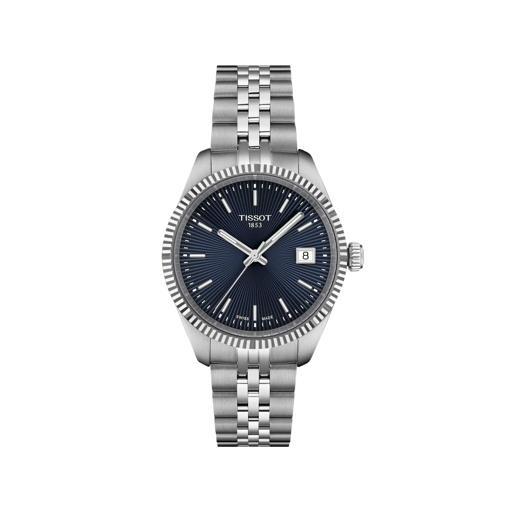Diese Ausführung der Tissot Ballade 34mm besitzt ein präzises Quarzwerk, ein 316L-Edelstahlgehäuse sowie kratzfestes, entspiegeltes Saphirglas. Dieses liegt schützend über dem dunkelblauen Zifferblatt mit Sonnenstrahl-Effekt und einer Datumsanzeige bei 3 Uhr.
