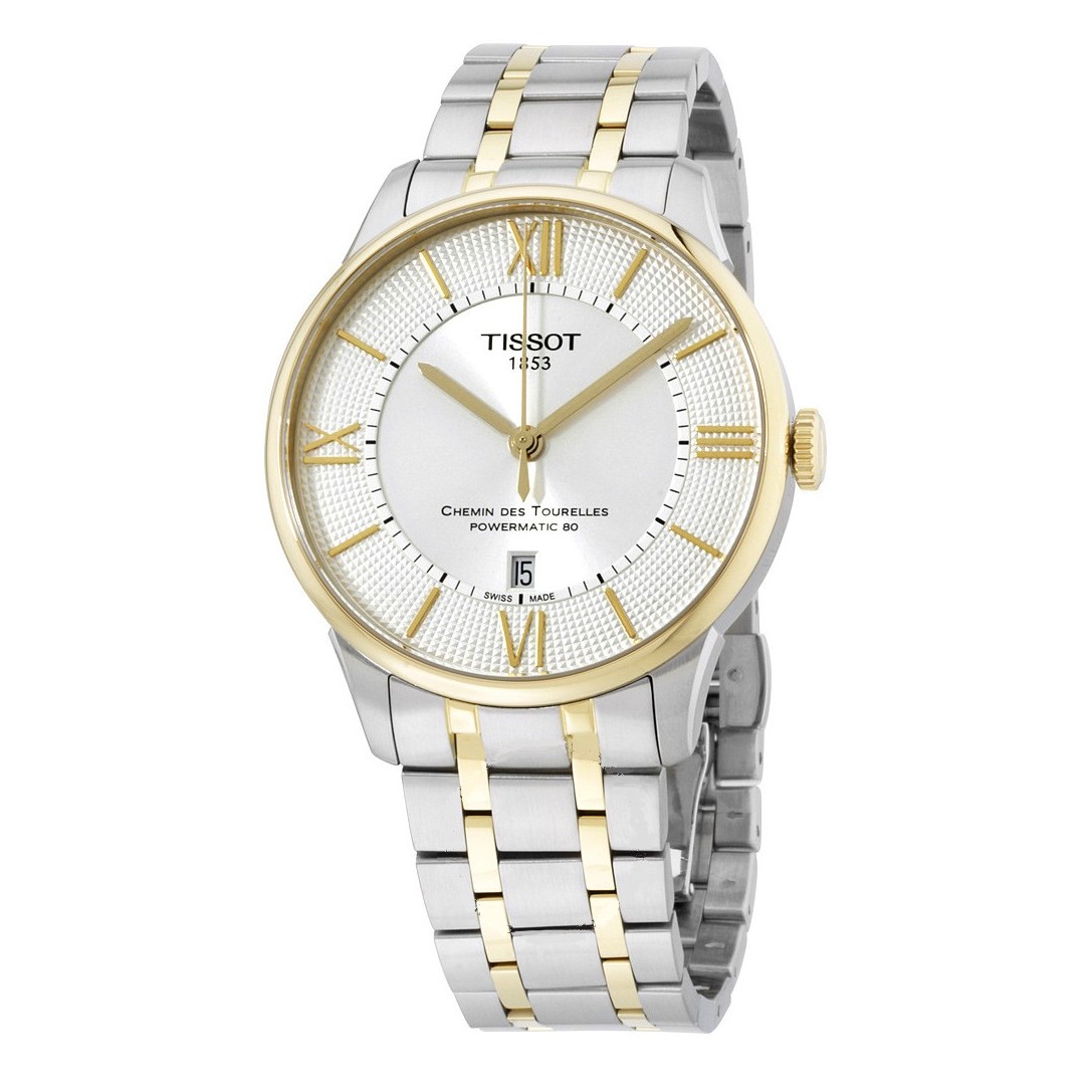 Chemin Des Tourelles Powermatic 80 Die Tissot Chemin des Tourelles ist eine ganz besondere Uhr, in der ein wichtiger Teil der Tissot-Geschichte verborgen ist. Sie hat ihren Namen von der Straße im Schweizer Ort Le Locle, in der 1907 die Tissot-Manufaktur errichtet wurde und wo das Unternehmen auch heute noch zu finden ist. Die Uhr ehrt die reiche, 161-jährige Erfahrung des Unternehmens durch ein zeitgemäßes Design mit elegantem Gehäuse. Die Tissot Chemin des Tourelles präsentiert sich in einer Vielzahl verschiedener Versionen, doch alle Modelle legen großen Wert auf Details und bieten genug, um jeden glücklich zu machen. Diese Dreizeigeruhr besitzt ein silberfarbenes Zifferblatt mit Sonnenschliff mit Clous de Paris Guillochierung unter den römischen Ziffern und eine Datumsanzeige. Das 316L-Edelstahlgehäuse mit gelbgoldfarbener PVD-Beschichtung und Sichtboden hat ein gewölbtes, kratzfestes Saphirglas mit Entspiegelungsbeschichtung, welches das Swiss-Made Powermatic 80 Werk schützt. Das 316L Edelstahlarmband mit gelbgoldfarbener PVD-Beschichtung hat eine Butterfly-Faltschließe mit Drückern.