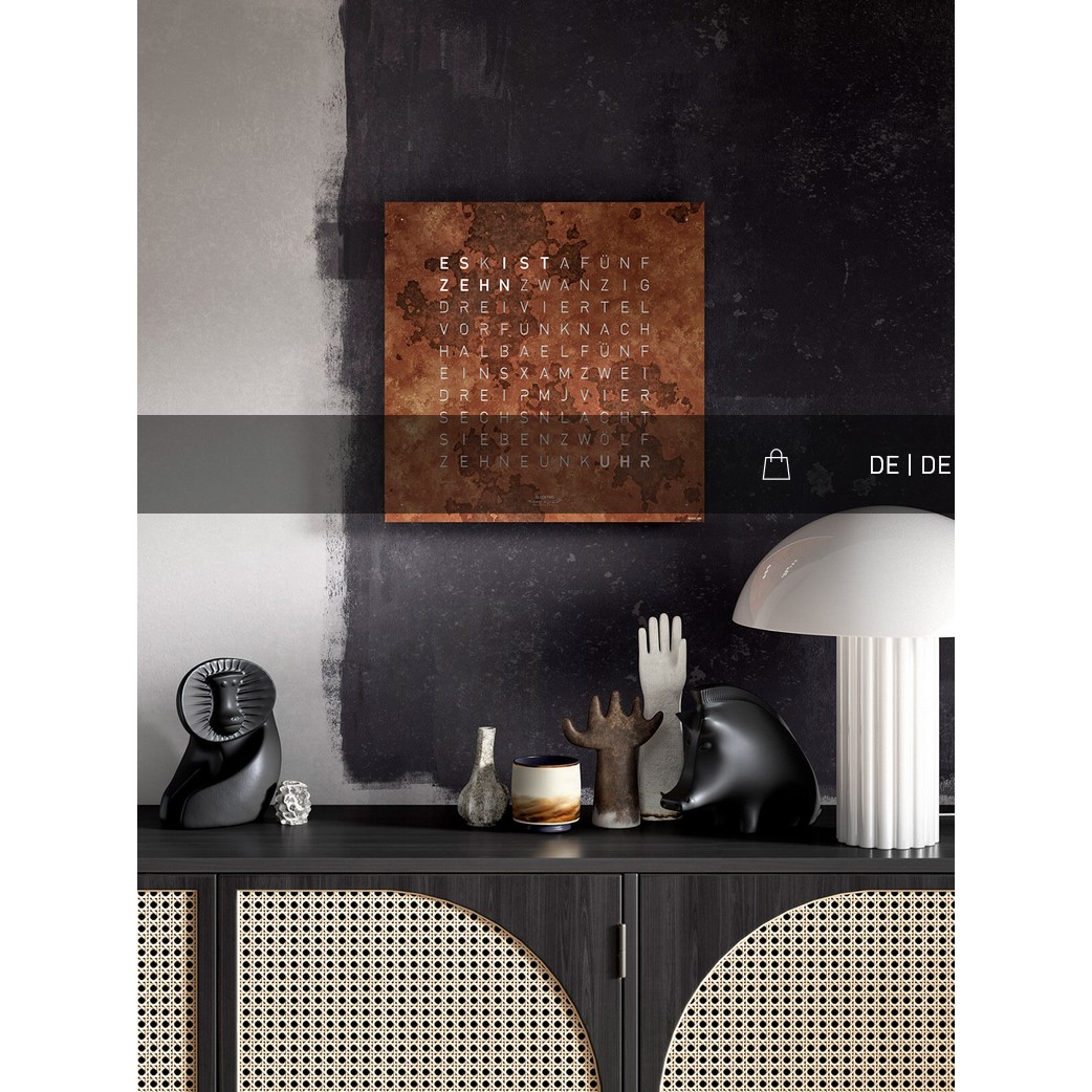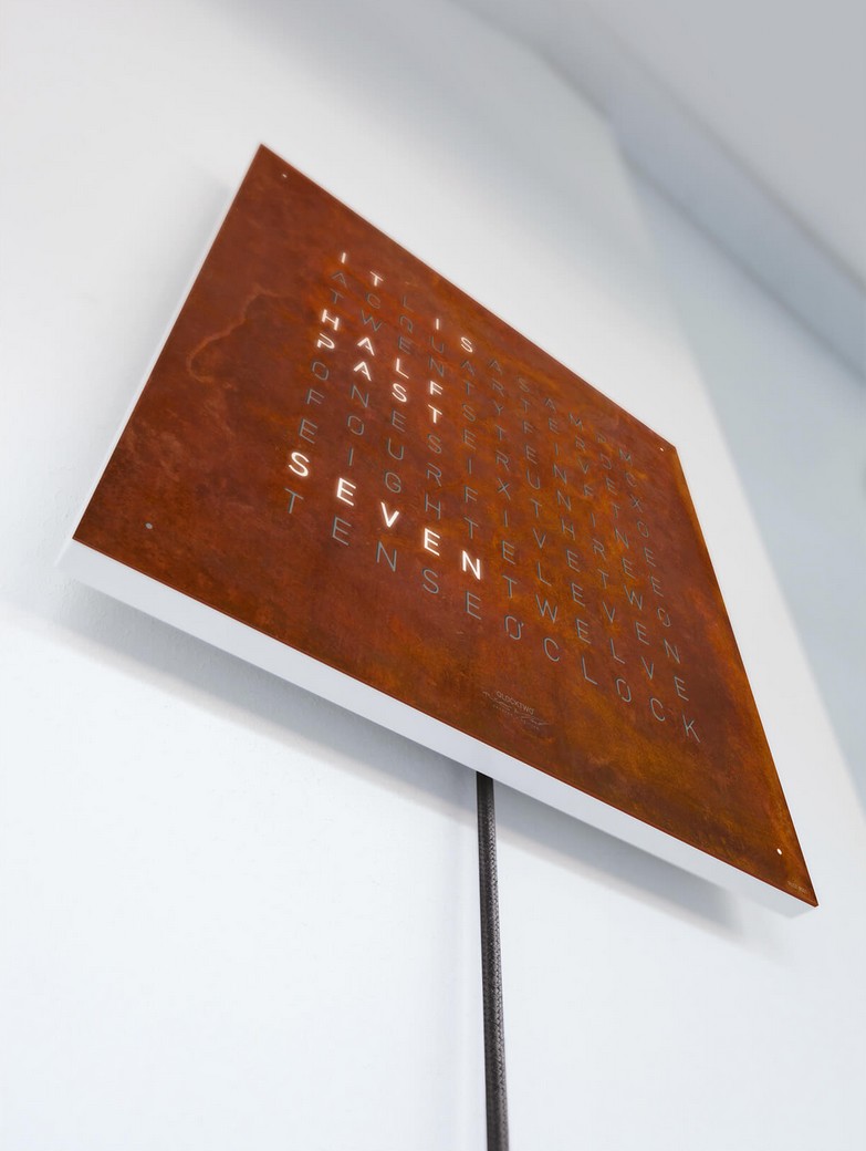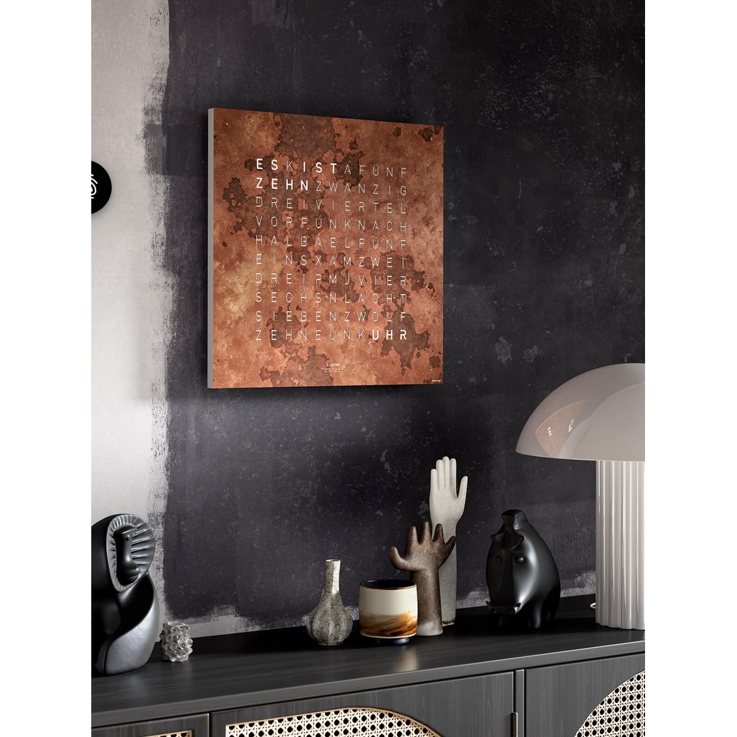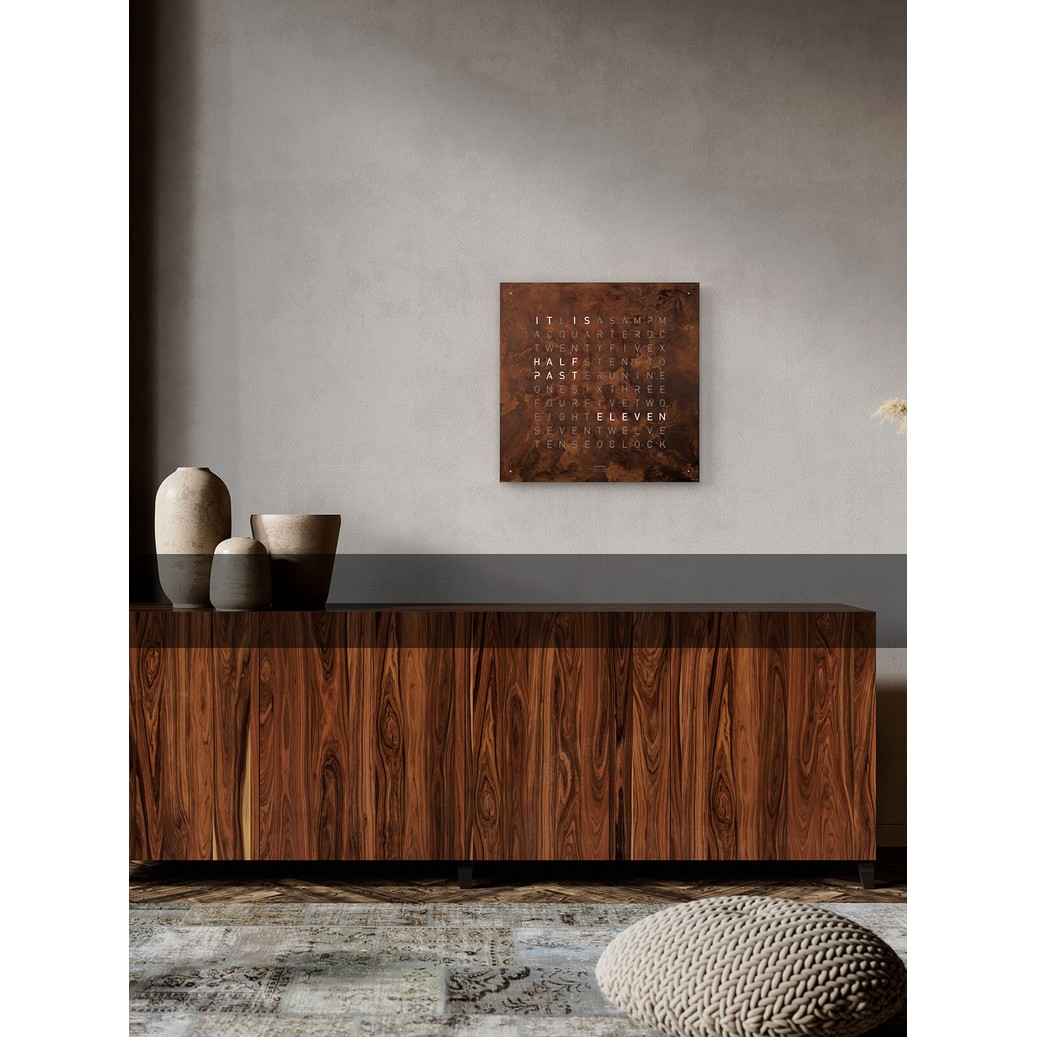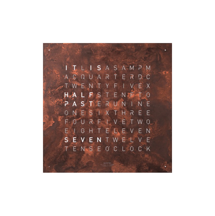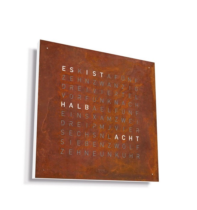 Jede QLOCKTWO CREATOR´S EDITION RUST wird aus Rohstahl in einem aufwändigen Verfahren von Hand geschaffen. Unsere Kunsthandwerker entscheiden bei jedem Stück individuell, wann die Oberfläche perfekt und die schönste Variation des rot-braunen Farbspektrums erreicht ist – manchmal ruhig, manchmal lebhaft aber immer ein einzigartiges Objekt.