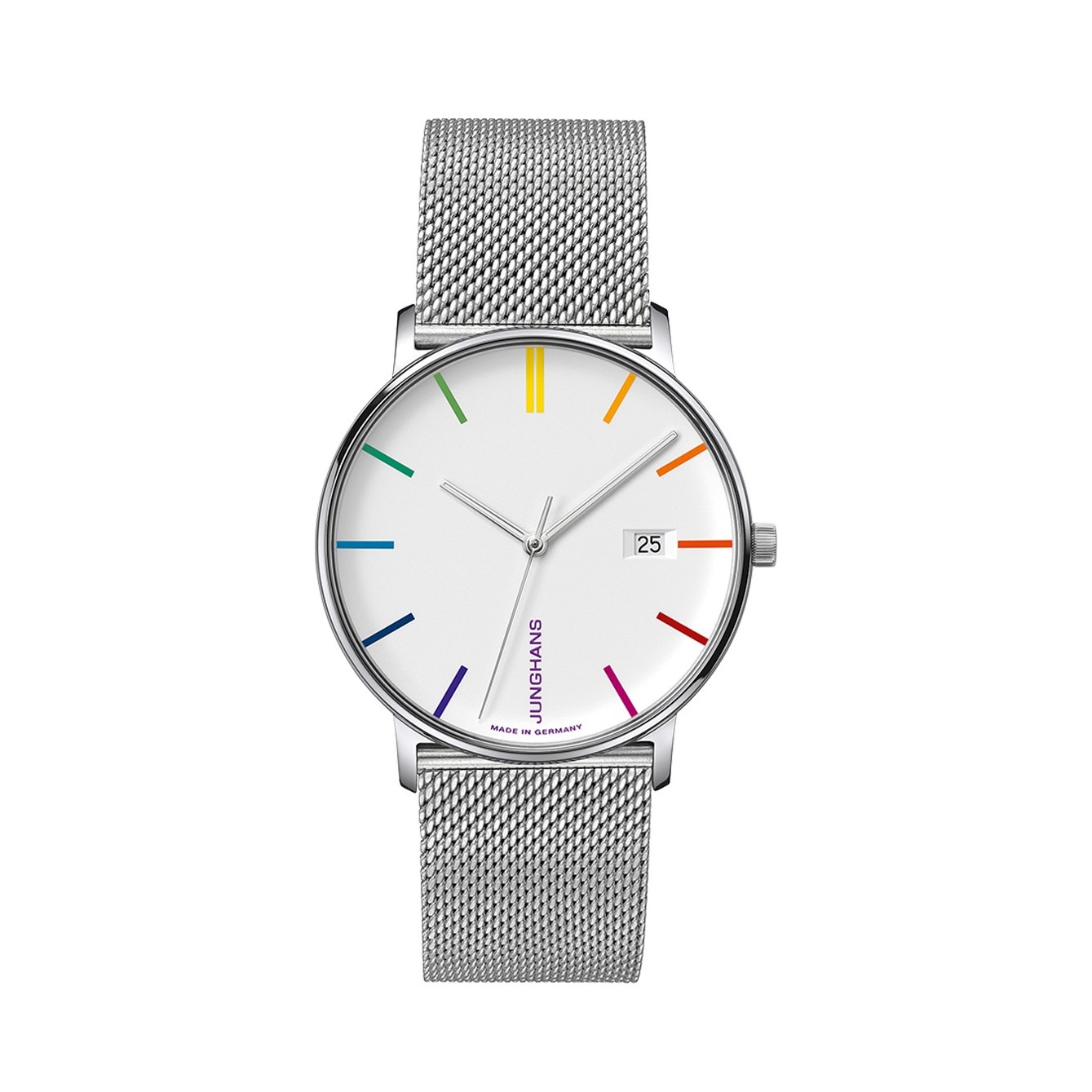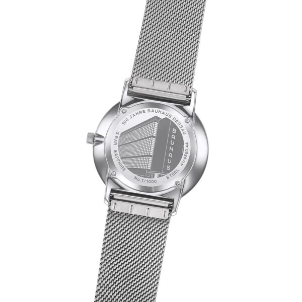 Mit der FORM Quarz Bauhaus feiern wir 100 Jahre Bauhaus in Dessau. Neben Formen waren Farben ein wesentlicher Bestandteil der Lehren am Bauhaus. Das Zifferblatt dieser auf 1000 Exemplare limitierten Uhr zeigt einen Farbkreis auf den 12 Stundenmarkierungen, der auf den Primärfarben basiert. Der Edelstahlboden zeigt ein Abbild des bekannten Gebäudes.