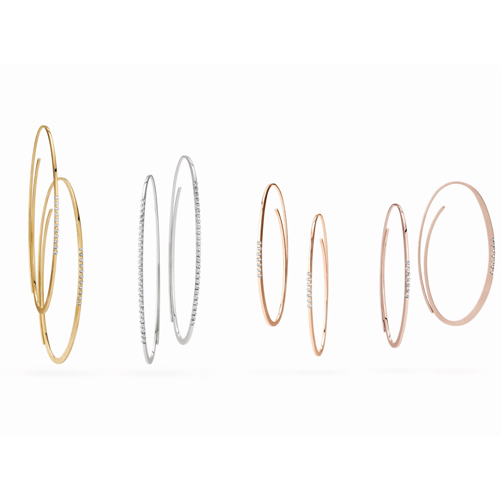 Auf Niessing Linear Brillant setzen Brillanten funkelnde Akzente: Sie scheinen auf der feinen, geschwungenen Vorderkante des filigranen Ohrschmucks zu schweben.