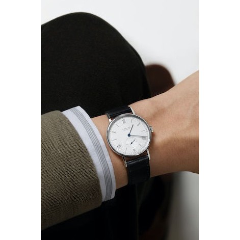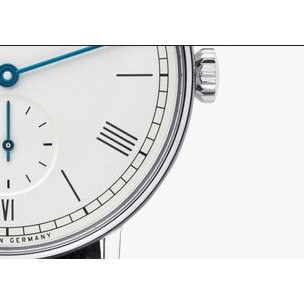 Ludwig ist die erwachsene Uhr für das seriöse Handgelenk: klug, traditionsbewusst, nicht ohne Coolness. Genießer lieben das Ritual des morgendlichen Aufziehens. Ludwigs Zifferblatt ist mit Eisenbahnminuterie und römischen Ziffern ganz klassisch gehalten. Eine Idee moderner dagegen die temperaturgebläuten Zeiger – bis zur Revolution ist aber noch Zeit.