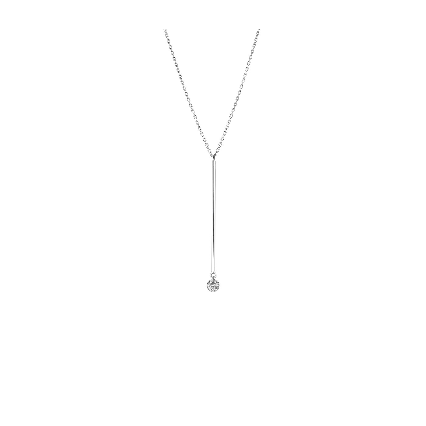 Design und Schlichtheit. Ein nackter Diamant, der an einem langen Stiel aus Weißgold baumelt, vibriert auf schelmischste Weise.