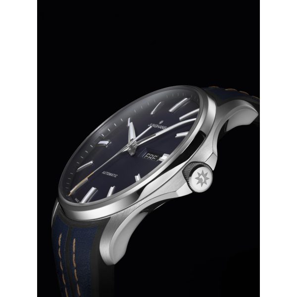 Bei der Arbeit. Beim Sport. In der Freizeit. Wann oder wo auch immer, die Meister S Automatic in Mitternachtsblau bleibt kompromisslos funktional. Und kompromisslos souverän. Beim ergonomischen Armband sorgt der auf der Haut aufliegende, erhabene Junghans Schriftzug im synthetischen Kautschuk für eine gute Unterlüftung.