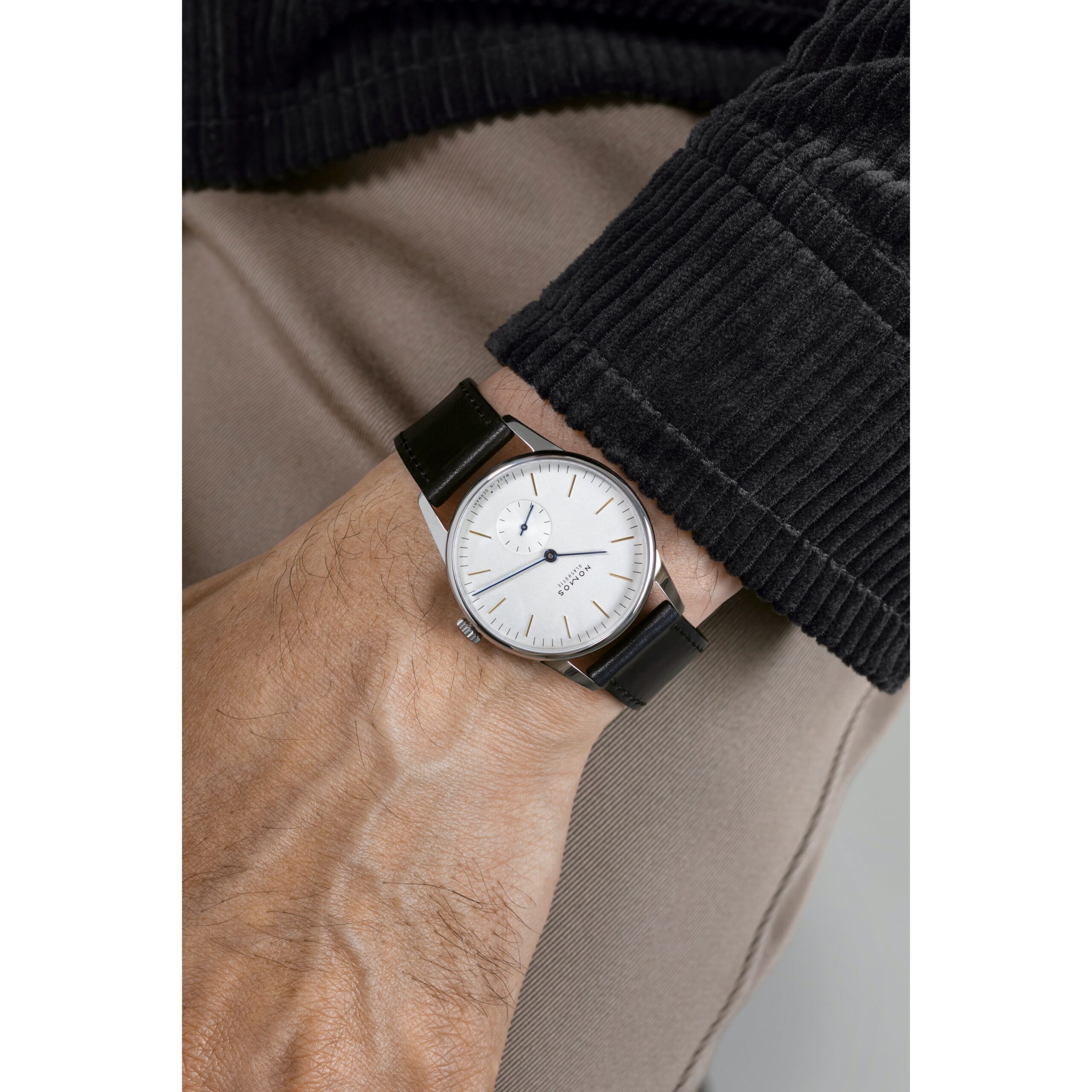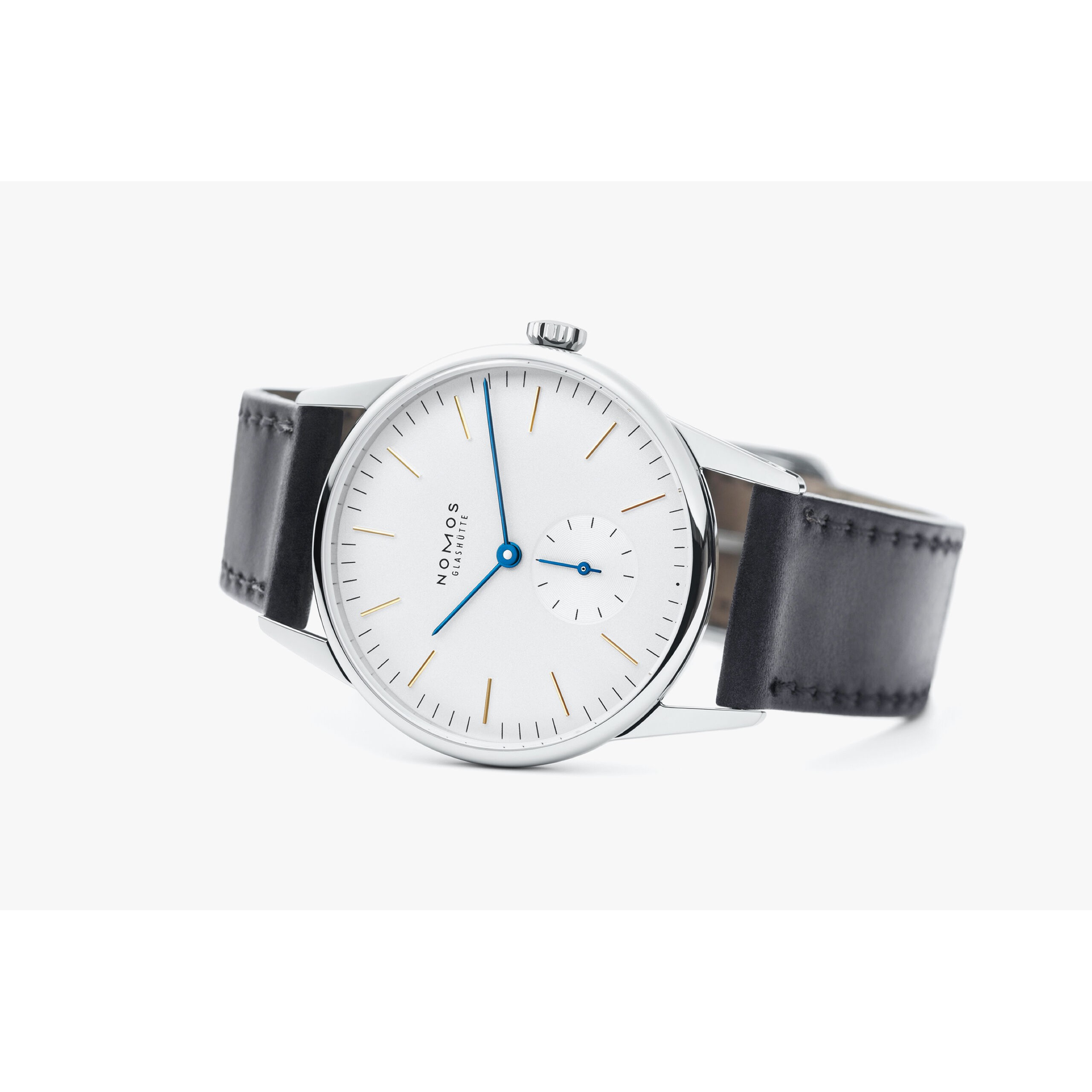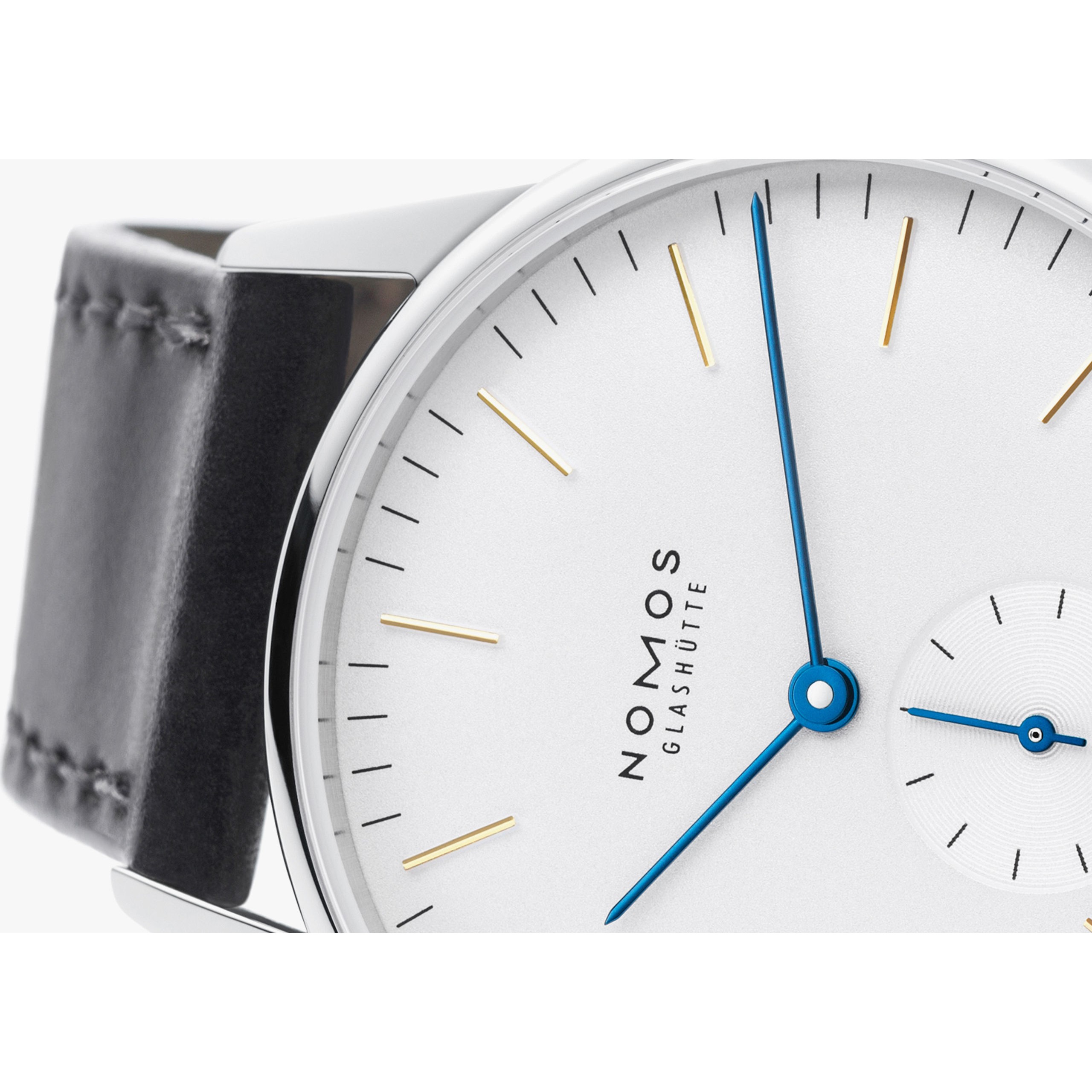 Orion ist die Lieblingsuhr vieler NOMOS-Gestalter – minimalistisch und klar, reduziert aufs Wesentliche: ein Modell in bester Werkbund- und Bauhaustradition. Diese Variante hier, mit Handaufzug, goldenen Indizes und temperaturgebläuten Zeigern auf weiß versilbertem Zifferblatt, ist so zeitlos, dass sie Sie auf Dauer begleiten wird.