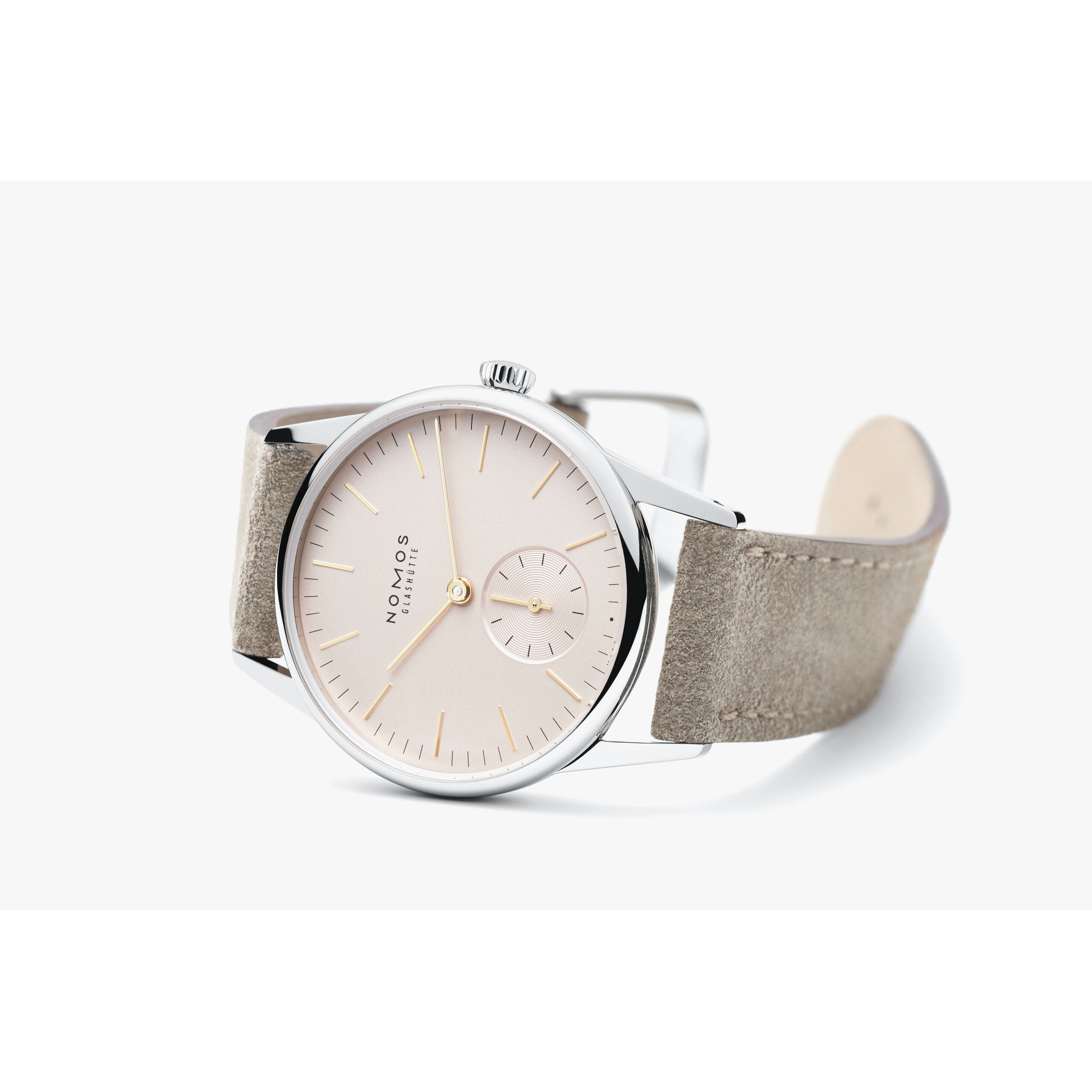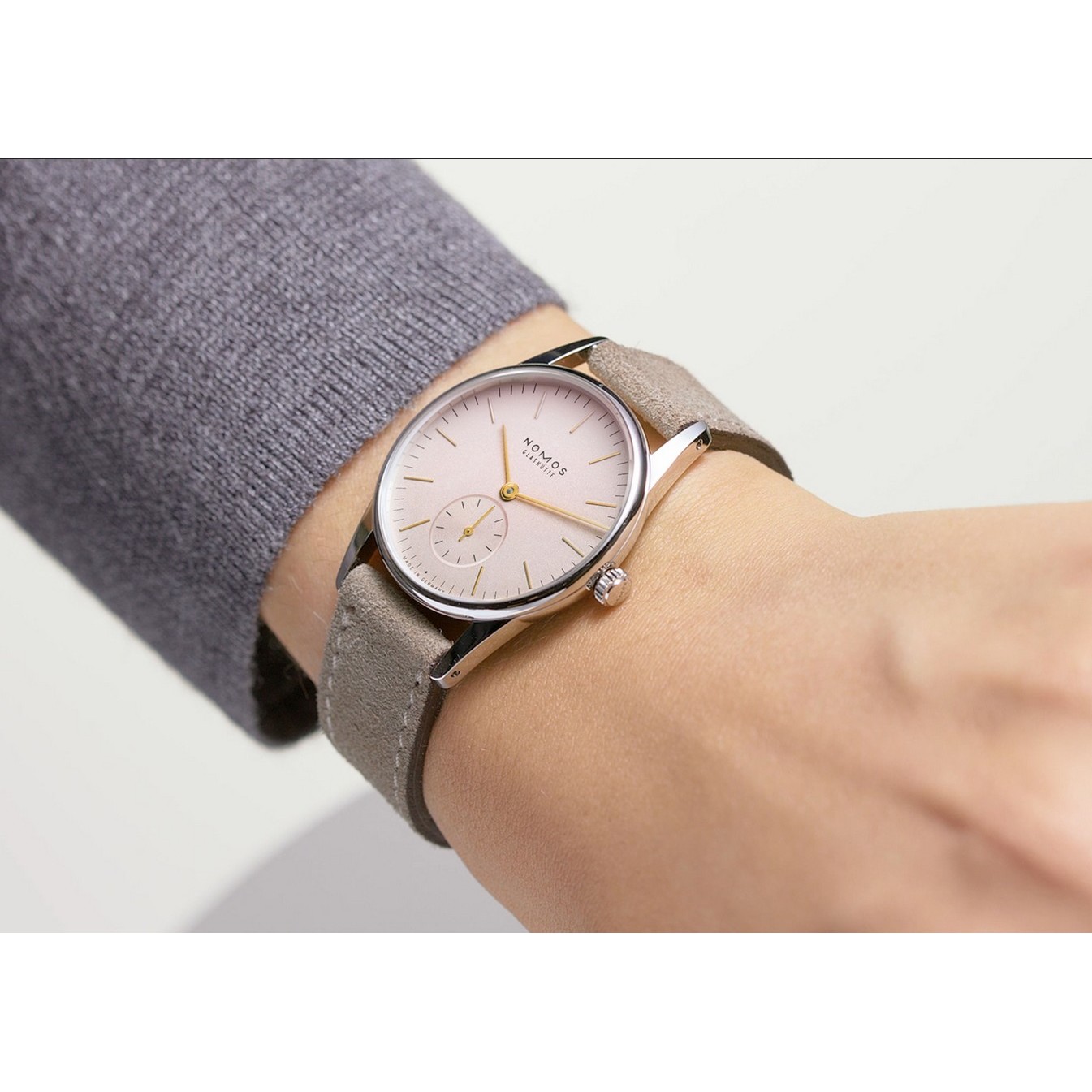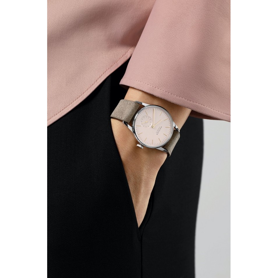 Leicht errötet, aber keinesfalls schüchtern: Diese kleinere Orion passt perfekt zu Schmuck und ist selbst ebensolcher. Mit dem hellen Roséton des Zifferblatts, einem Durchmesser von nur 33 Millimetern und dem hellen Velourslederband ist diese schöne Glashütter Handaufzugsuhr ideal für zartere Handgelenke.