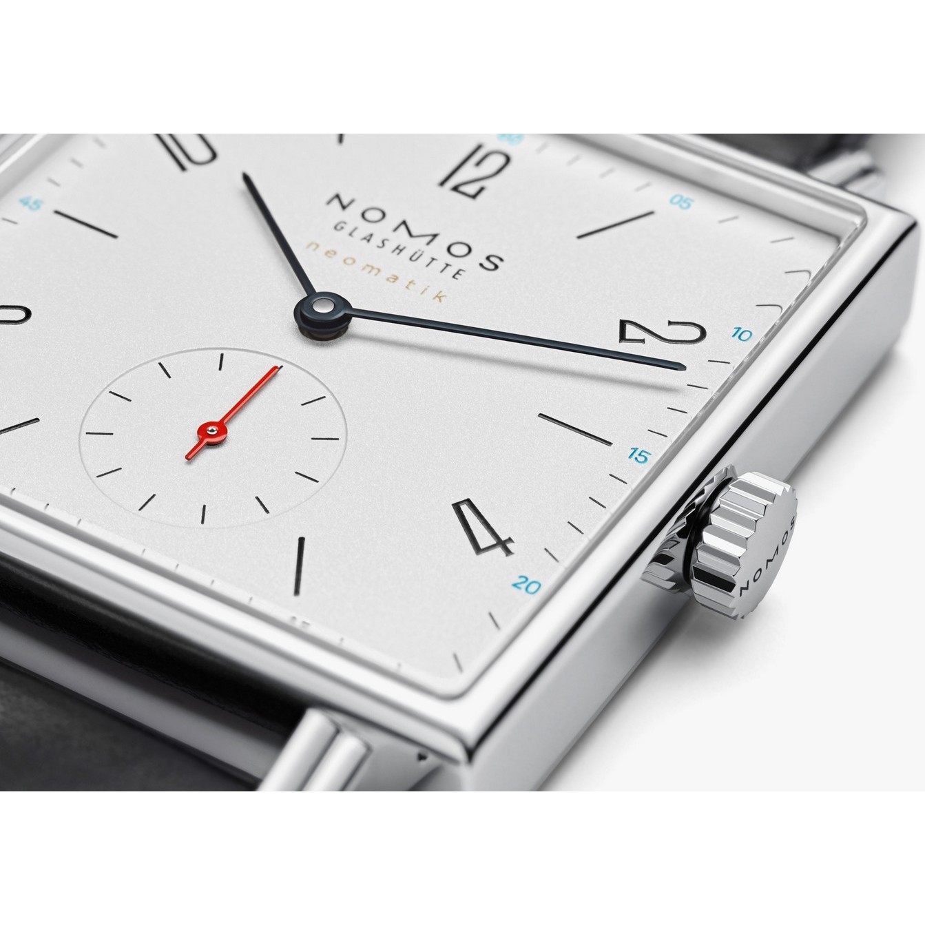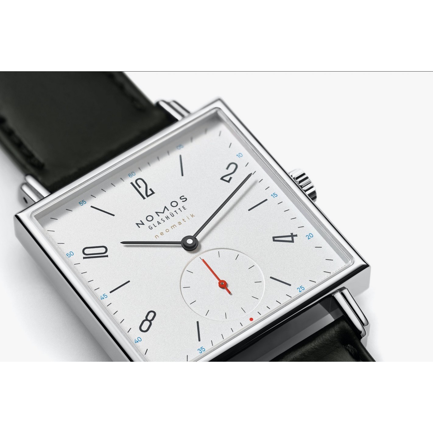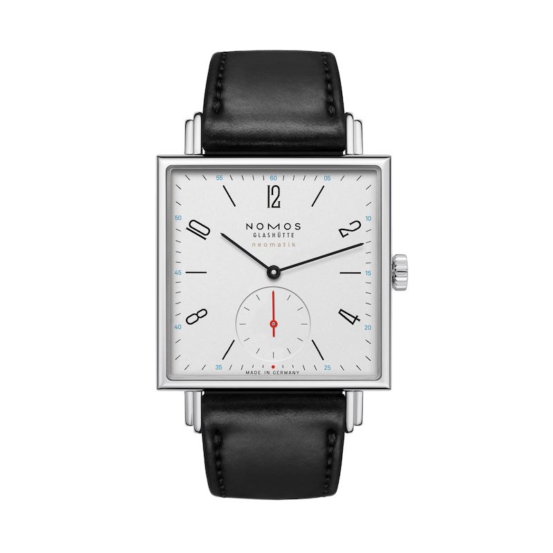 Die Quadratur des Kreises: Wem stehen eckige Uhren besser – Männern oder Frauen? Denn eckig ist nicht gleich eckig: Mit einer Kantenlänge von 33 Millimetern und cyanblauen Akzenten erscheint Tetra neomatik äußerst sportlich und maskulin. Das superflache Automatikwerk DUW 3001 allerdings tickt Herren wie Damen gleichermaßen an.
