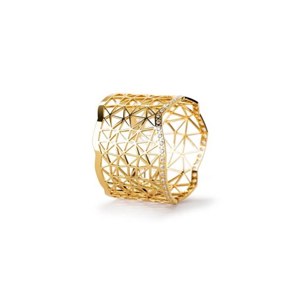 Ein endloses Band mit dem feinem Topia Vision Muster windet sich um den Finger, ohne Anfang und ohne Ende. Das schmückende Muster verleiht dem filigranen Schmuck zugleich seine große Stabilität. Die glänzende, dynamische Außenkontur kann auf einer Seite dicht an dicht mit feinsten Brillanten ausgefasst werden. Ihr Funkeln lässt die Oberfläche des Rings noch irisierender scheinen: wie eine schillernde, kostbare Seifenblase aus purem Gold . See your dreams come true!