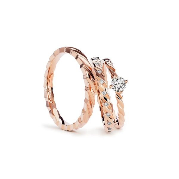 Kunstvoll geflochtene Trauringe und ein begleitender Verlobungsring symbolisieren Ihre harmonische Einheit. Die Woven Love Ringe repräsentieren nicht nur die unaufhörliche Entwicklung und Stärkung der Liebe im Laufe der Zeit, sondern auch die Beständigkeit. Das Triset steht für die untrennbare Bindung zweier Seelen und zeugt von einer Liebe, stark genug, um Herausforderungen zu überstehen und dabei immer fester zusammenzuwachsen.